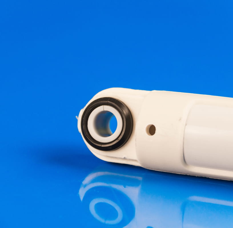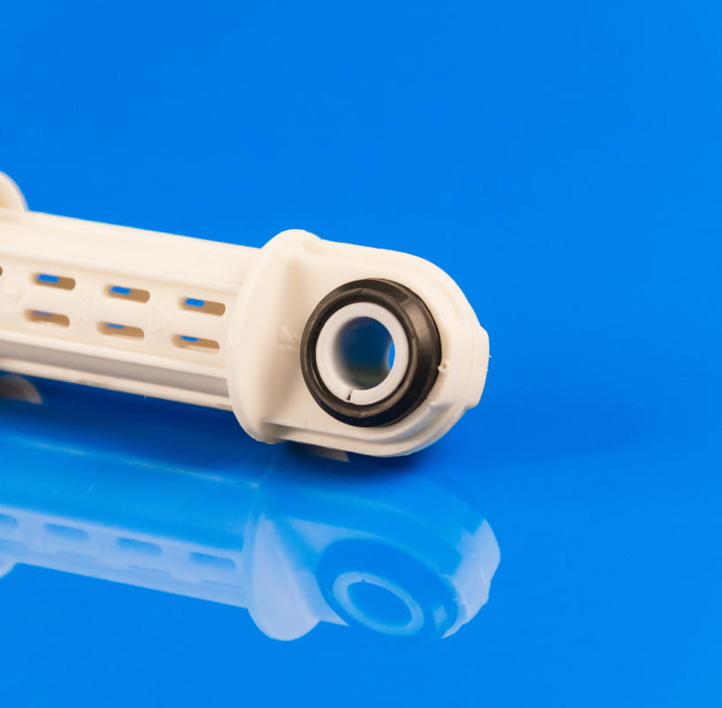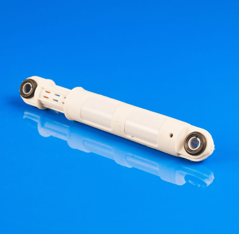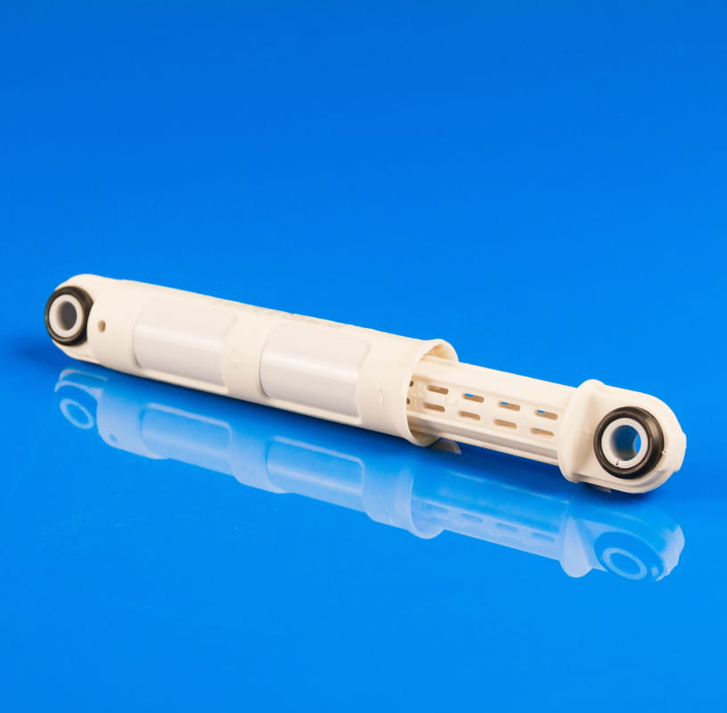 Amortyzator składa się z cylindra i wsuwanego tłoczyska, zakończonych mocowaniami do obudowy pralki oraz do zbiornika. W czarne silentblocki włożone są białe plastikowe tuleje (patrz zdjęcie nr 1). Montaż odbywa się przy pomocy plastikowych zatrzasków.
